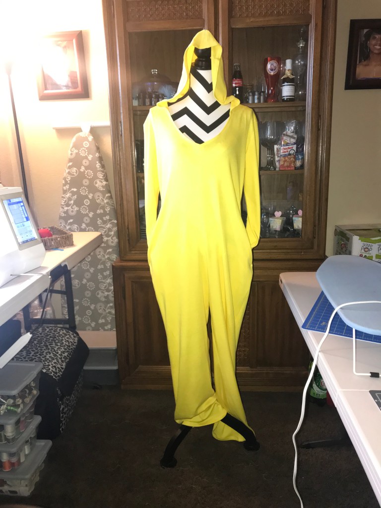 The description for the cardigan is a semi-fitted vest and cardigan.I made the cardigan in View B. I had this mustard color knit fabric that I found at Joann Fabric picked out, but then I changed to the blue. The pattern calls for moderate stretch knits, such as sweater knits double knit, sweatshirt fleece, or cotton knit.